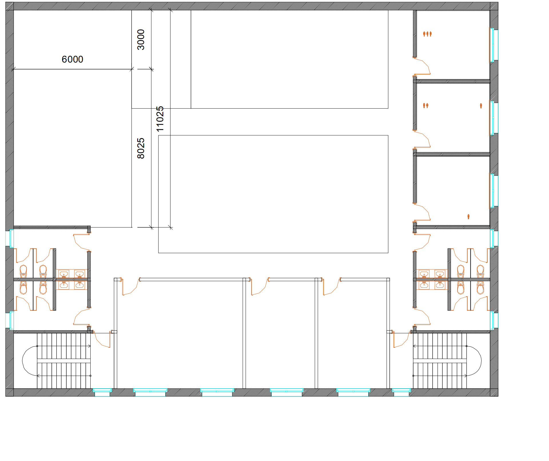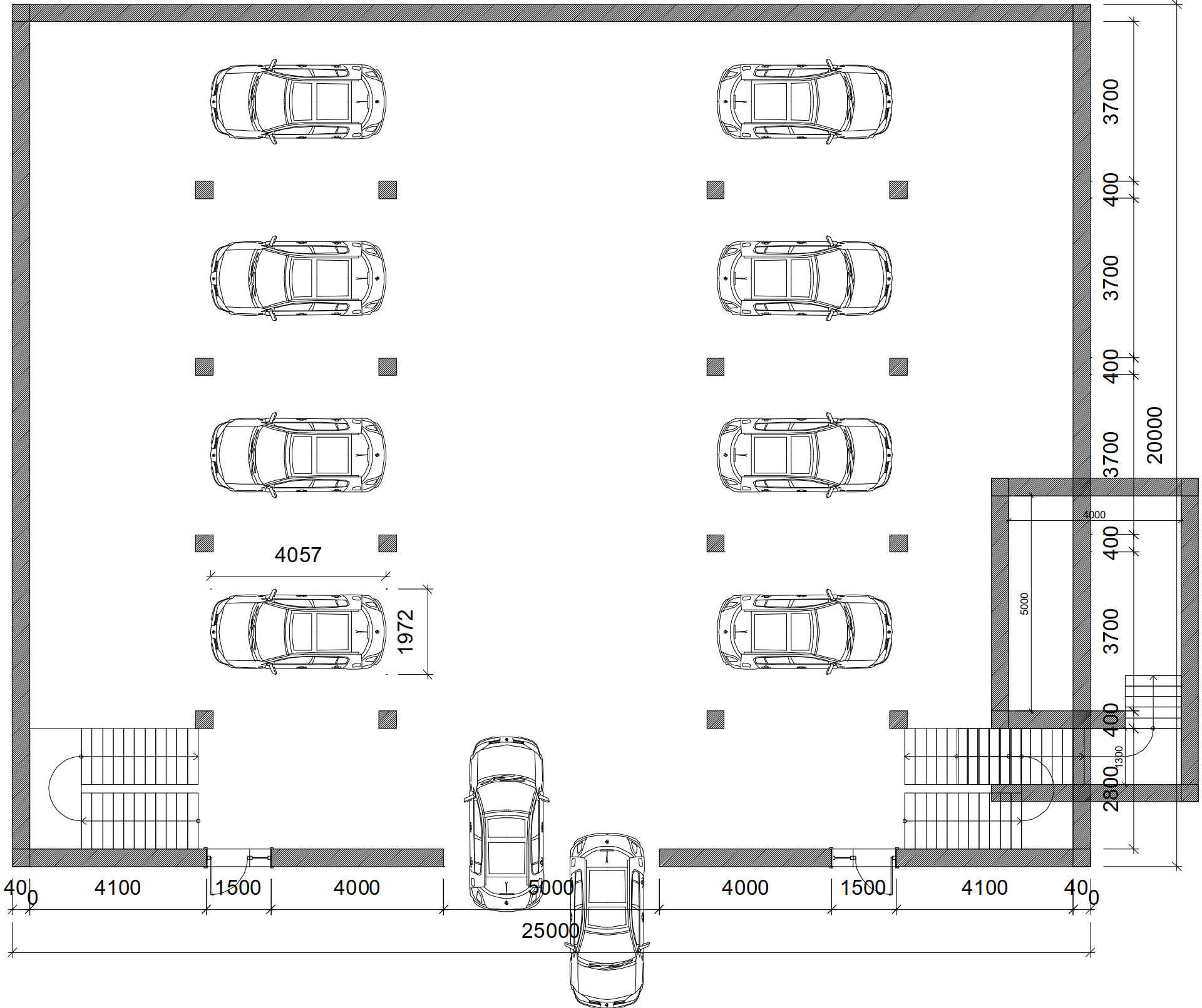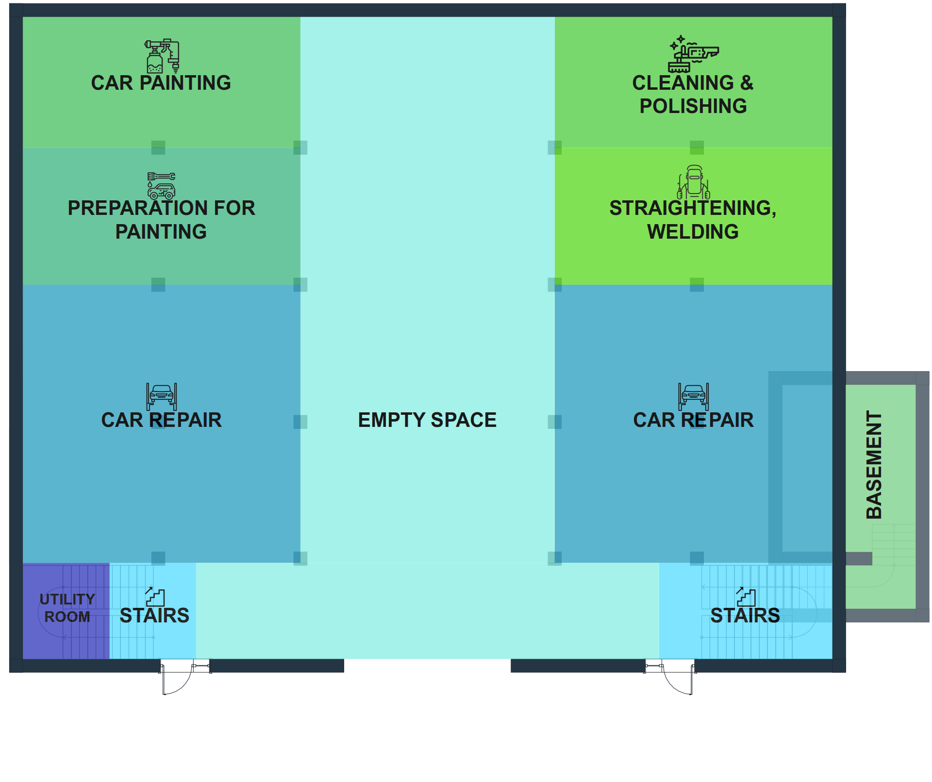 The ground floor of the building will support an automotive repair business. The automotive work floor ceiling is 4 meters high and is completely enclosed. There are two areas (Blue) for automotive repair. Each area is open and has been setup with two lifts. At the far end of the left side of the first floor is one enclosed work area for auto body repairs (Preparation of Painting) and a second enclosed Paint Booth. On the far right side of the first is one open area for straightening, welding and car disassembly (i.e. parts) and a second work area for Cleaning and Polishing. The large center area labeled as Empty Space contains one subfloor work area (i.e. trench) for repair of larger vehicles such as buses. The commercial auto center will service and maintain our Cultural Mobility Work & Travel fleet of vehicles.