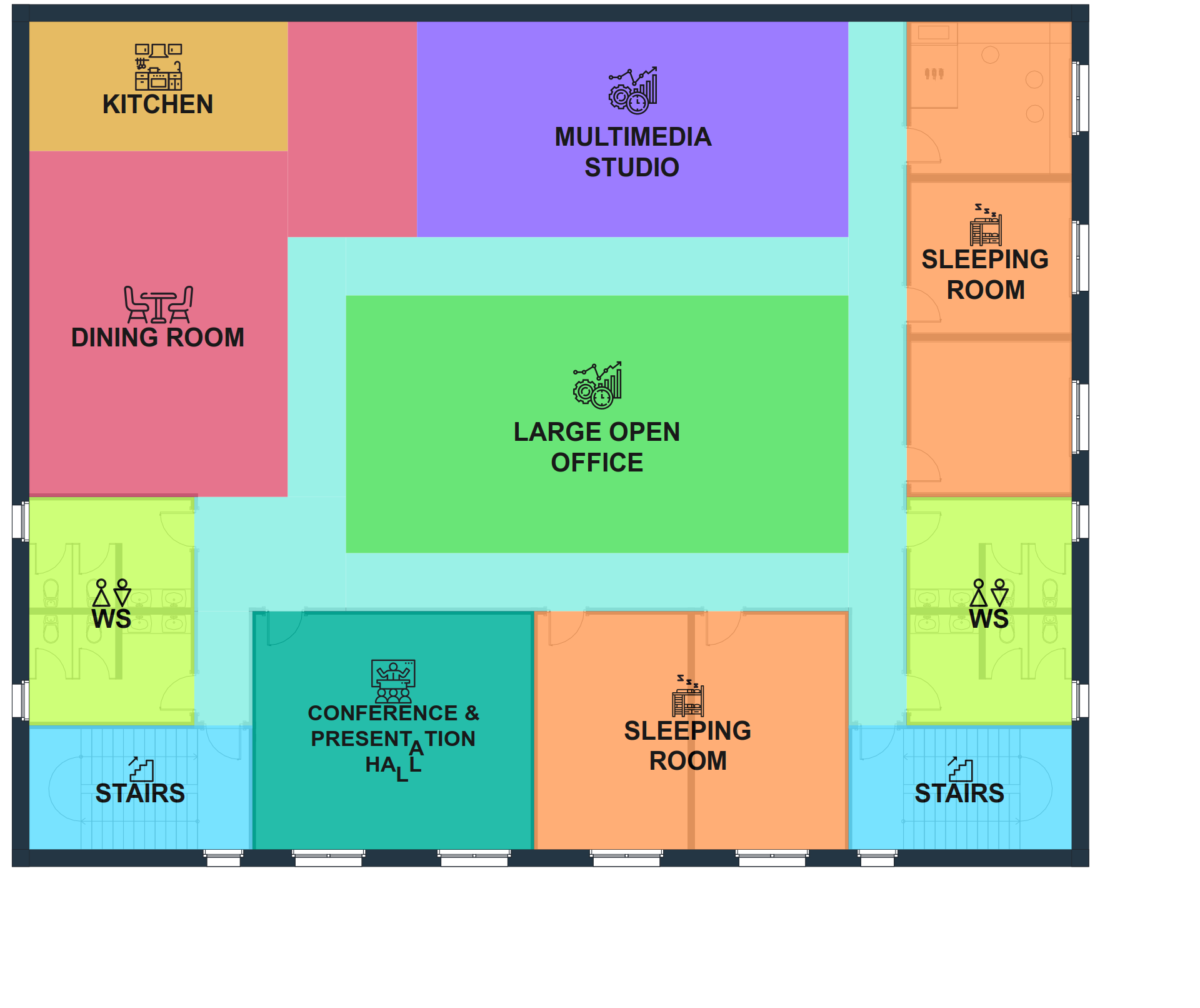 Our studio camera crews will be right there to record all of the action. Flexibility and portability are two key factors in our interior floor design. Portable Kitchen Islands separating the dining and cooking areas can be pushed away to open up free flowing space throughout the floor. The islands will be used to prepare and serve food; as table tops while filming product review videos and as comfortable seating areas when used with bar stools. The dining area extends towards the front of the building so that during production of our cooking shows, the cameras have enough room to film a wide shot. The dining area flows into the Large Open Office Area to create a Loft Style Office. We designed our floor layout to achieve maximum collaboration and the free flowing exchange of ideas. In fact, only the sleeping rooms and the Multimedia Studio are enclosed. Five dedicated sleeping rooms and one multipurpose conference room that can serve as an additional sleeping room during peak demand can accommodate as many as thirty-six guests. The Multimedia Studio is a scaled down version of the layout for the third floor once the building is complete.