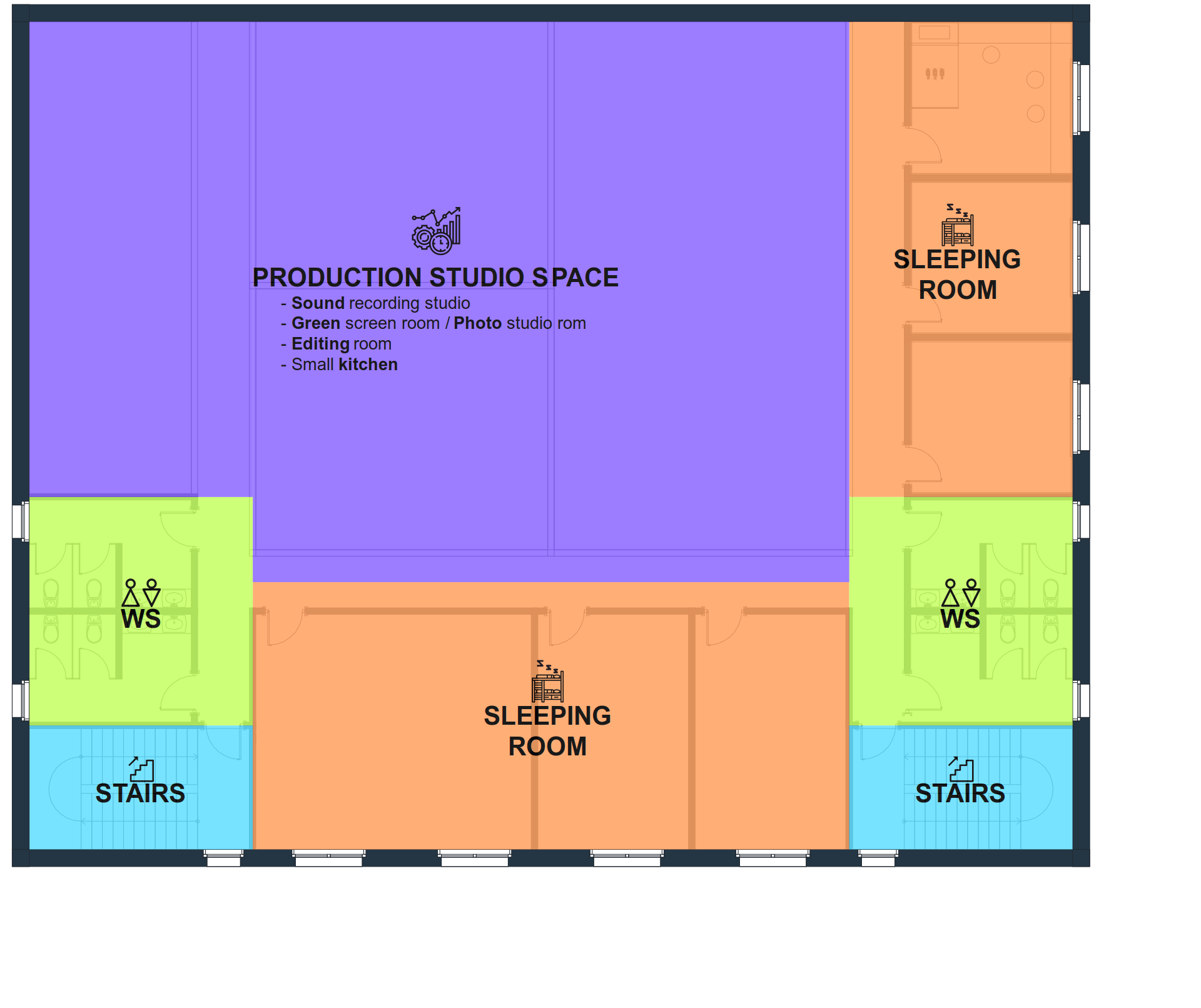 The third floor is comprised of Production Studio Space and additional sleeping quarters. There are five (5) sleeping rooms with the same layout as the second floor and one larger room for VIP guests. We envision dividing the Production Studio Space into several smaller rooms including one large production room; photography studios and green rooms; sound and recording studio; a digital editing room and a small kitchen. We will not make our final design on layout until after working in the smaller Production Studio on the second floor.